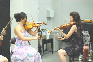 山瀬理桜を中心に、アシスタント先生やハルダンゲルヴァイオリンの生徒さん、総勢9名のレッスンは真剣な様子で、奏でる純正律のハルダンゲルヴァイオリンの音色は、北欧の澄んだ白夜の風景を醸し出し、見学者様も日本の蒸し暑い夏を忘れ、しばしなごまれているのが印象的でした。