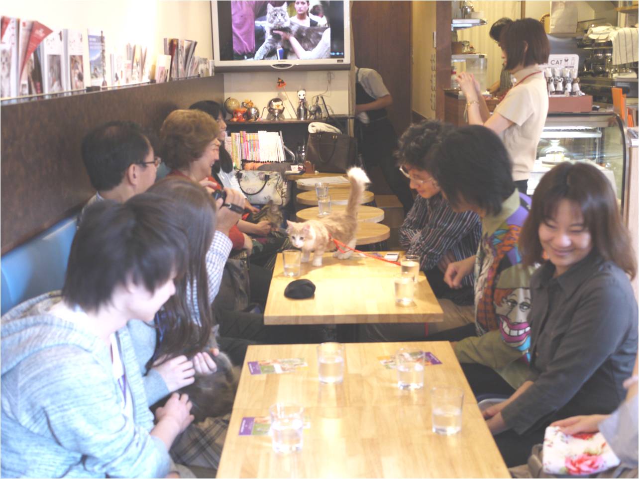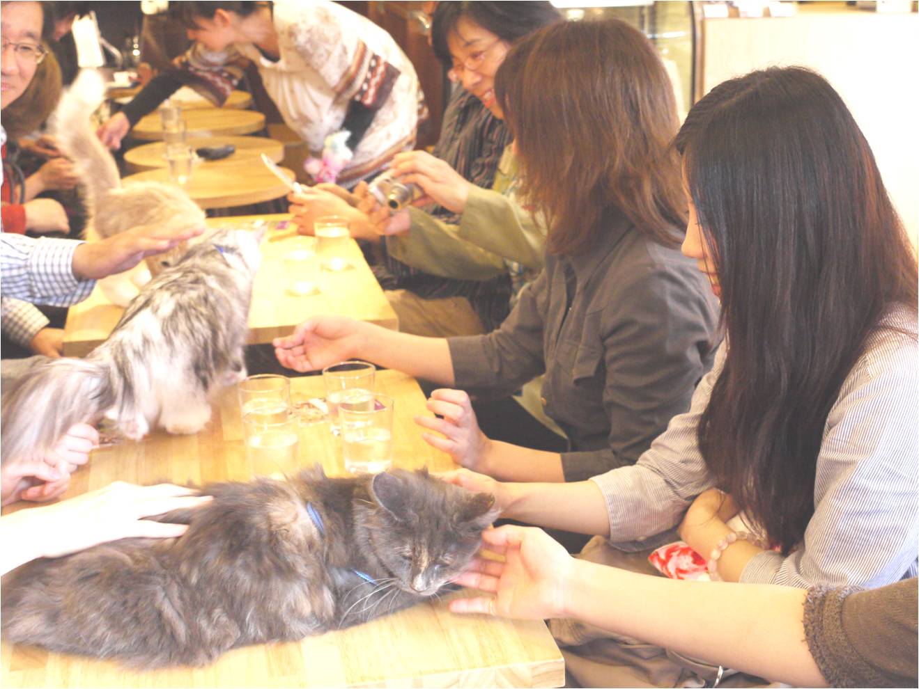 お話のあとはノルウェー猫ちゃん5匹が登場。彼らは本当におとなしくて可愛く、テーブルの上で参加者に抱っこされたり、なでられたり、一緒に写真を撮ったり、楽しい一時でした。参加者のみなさんもお店の方を含めてみんな自然と笑顔になり、猫ちゃんたちに夢中でした。やはりペットは人を幸せにするものですね。