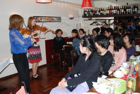 また今回は、北欧ヴァイキングが遠征し、文化を高めたシシリア地方の料理のお店でドルチェ(デザート)をおいしくいただき、トークの後には山瀬理桜理事長と、山瀬クリスティーナ静香さんがハルダンゲルヴァイオリンを演奏し、手拍子で盛り上がりました。ハルダンゲルヴァイオリンの演奏を初めて聴かれた方も多く、美しいフォルムと音色に耳を澄ましていらっしゃいました。