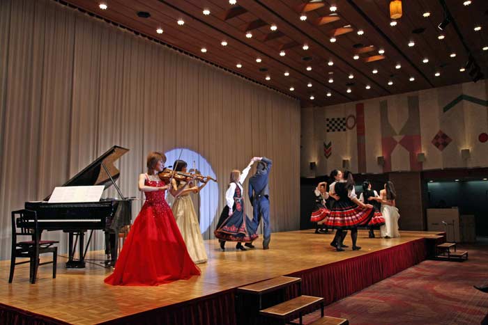 今回は山瀬理桜コンサートではおなじみのメンバーの中村真理さん(ピアノ)、山瀬クリスティーナ静香さん(ハルダンゲルヴァイオリン&歌)、矢野小百合さん(ハルダンゲルヴァイオリン)に加えて、北欧ダンスグループの皆様とのコラボレーションもあり会場が一層華やぎました。