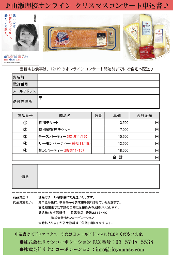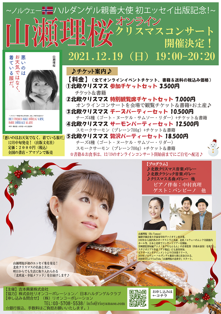 ぜひクリスマス前のひと時、ノルウェーの食事と共に、山瀬理桜のクリスマス オンラインコンサートにご参加ください!